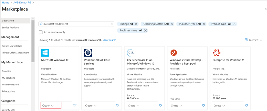 17. Select Create, in search box search for Microsoft windows 10 select Microsoft windows 10 then click on Create select Windows 10 Pro version 22H2.
