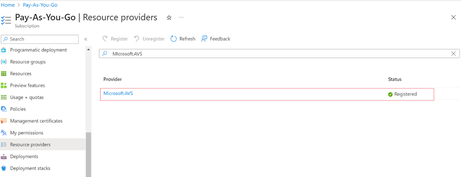 3. In Resource Provider, make sure to use Microsoft.AVS is registered.