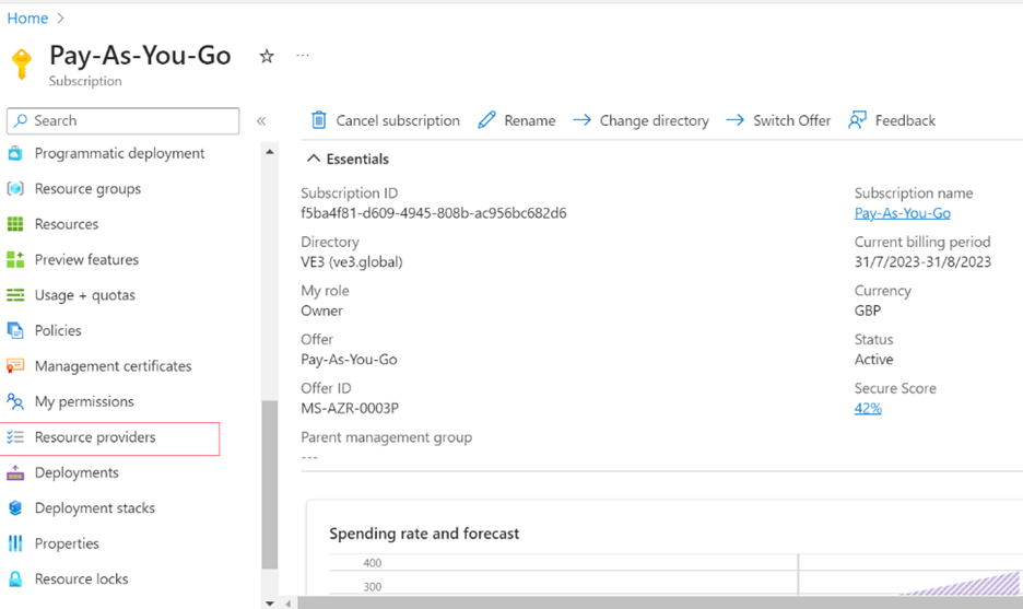 2. Navigate to the Azure Home page, open your subscription, in our case, pay-as-you-go, and select Resource Provider.