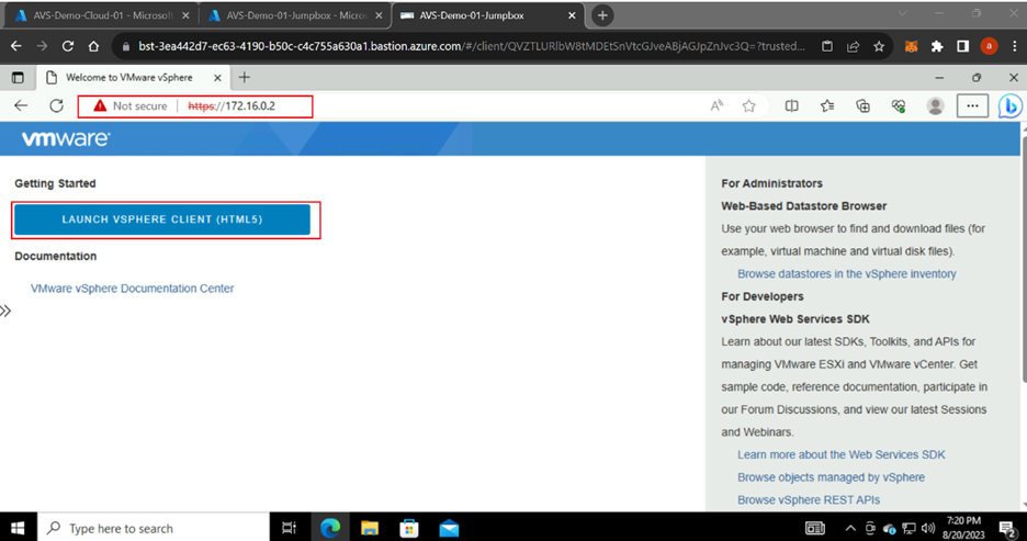 23. Paste the copied URL in browser of Virtual Machine which logged in previously, site could return connection isn’t private message select Advanced and continue to 172.16.0.2(unsafe). Select LAUNCH VSPHERE CLIENT (HTML 5)