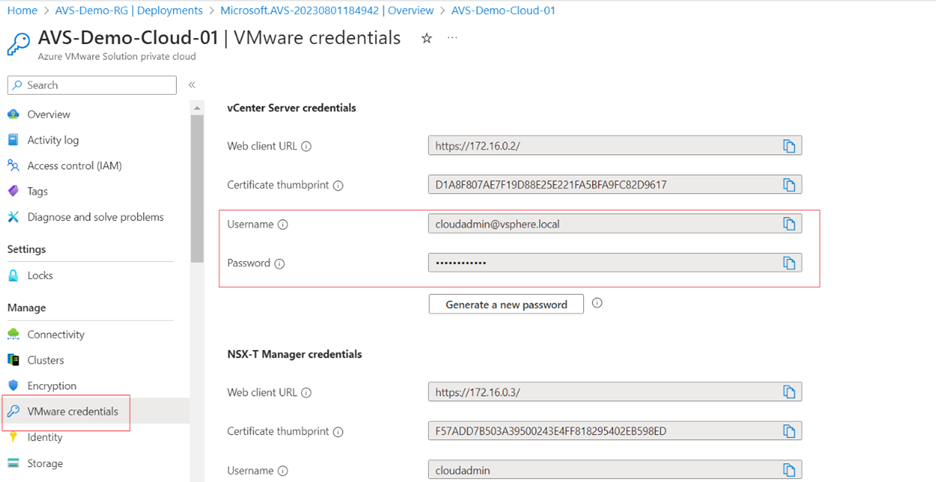 22. Now Navigate to your azure Home page select your AVS private cloud which is deployed earlier select VMware credentials in left panel, copy Web client URL of vCenter Server credentials.