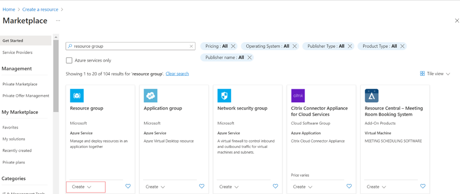 4. Navigate to Azure Home. Select create a resource and create a resource group.