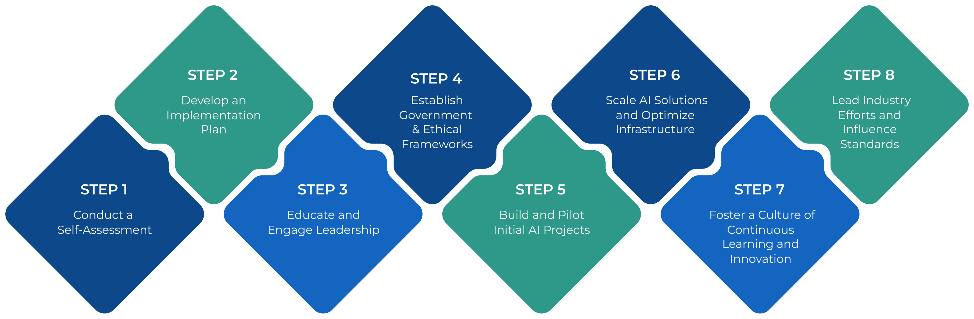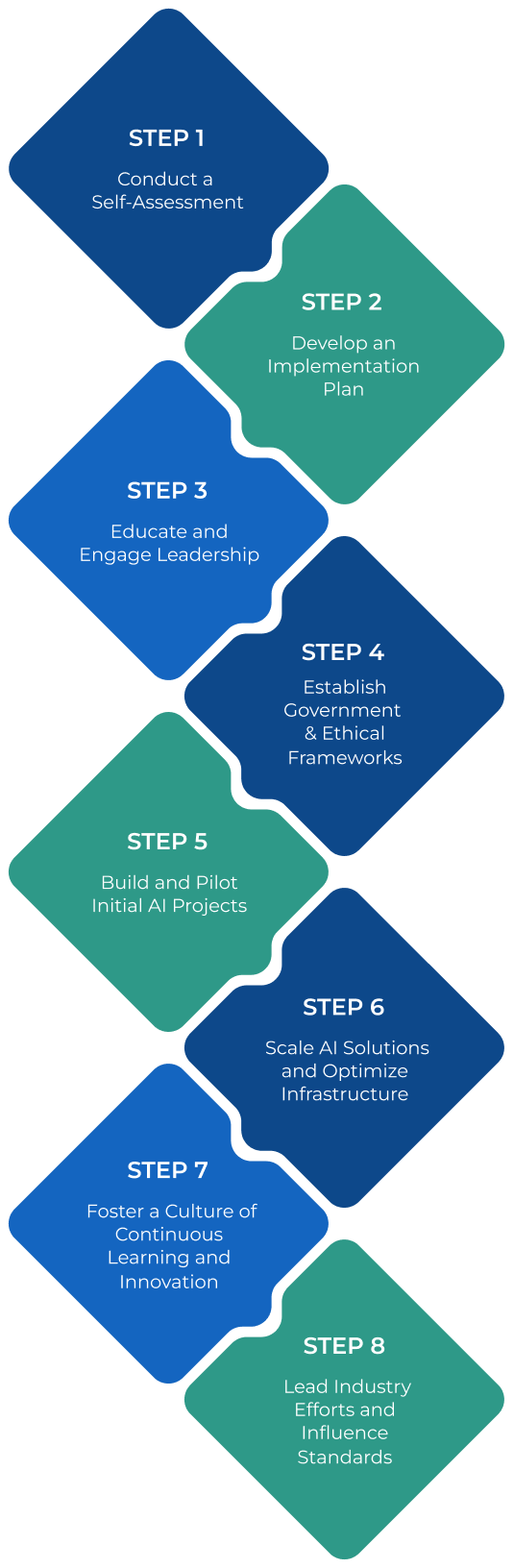 The implementation roadmap provides a structured approach for adopting and scaling AI responsibly. It ensures organizations progress methodically through each maturity stage while continuously improving governance and performance.